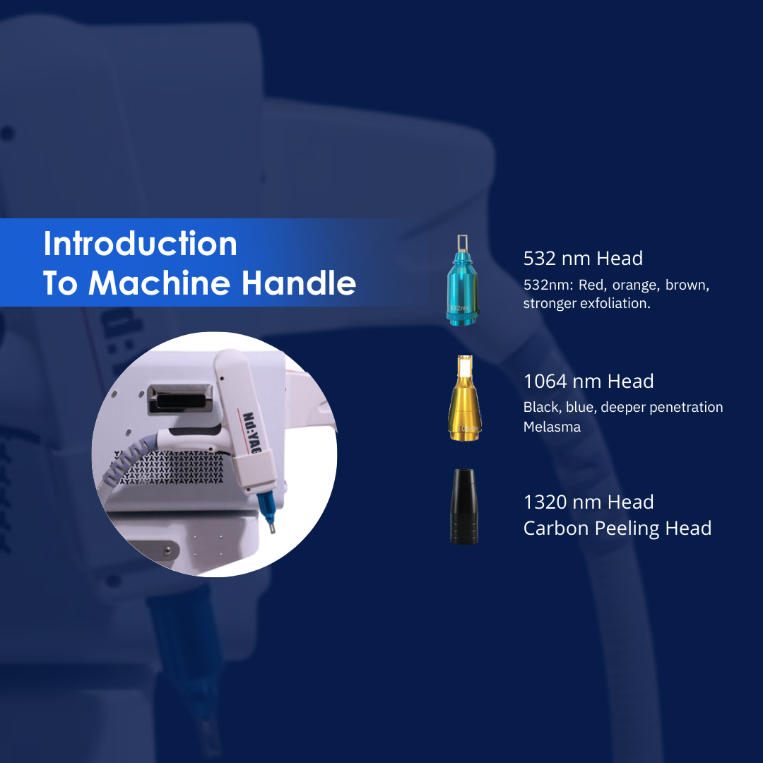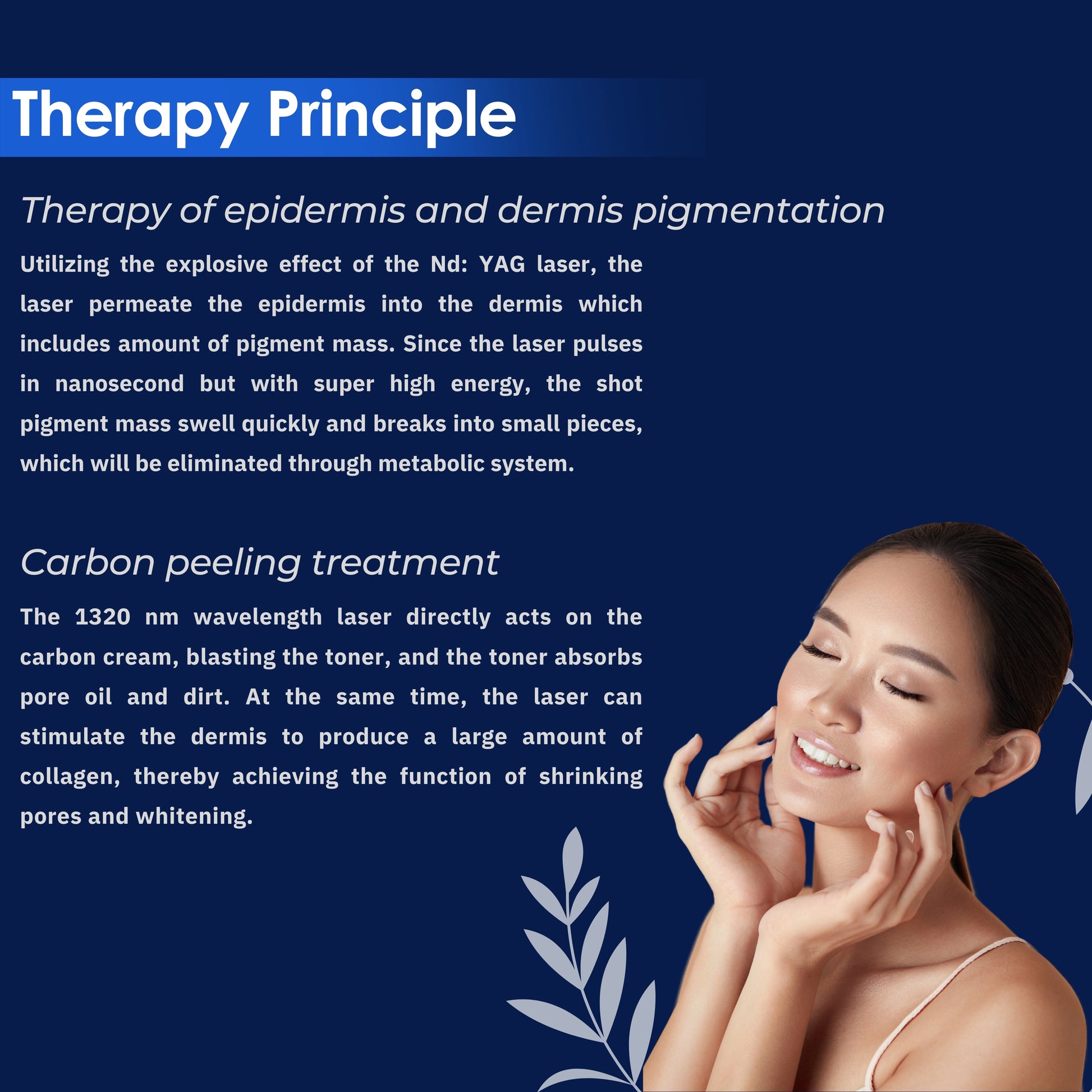 Nd Yag Laser equipment adopts Q switched mode, which makes use of the instantaneous emitted laser to break the pigment in ill structure.